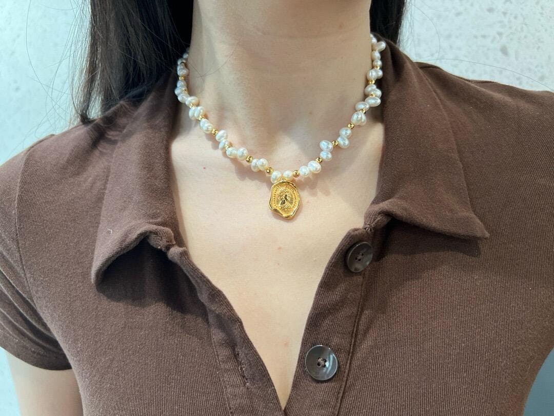 Sublimez votre sophistication avec le collier de perles Claudette, orné d'un pendentif gravé en or vermeil 18 carats et de perles d'eau douce scintillantes. Soigneusement confectionné à la main, ce bijou est bien plus qu'un simple bijou : il symbolise puissance et raffinement. Adapté à toutes les occasions, ce collier dégage une aura royale.